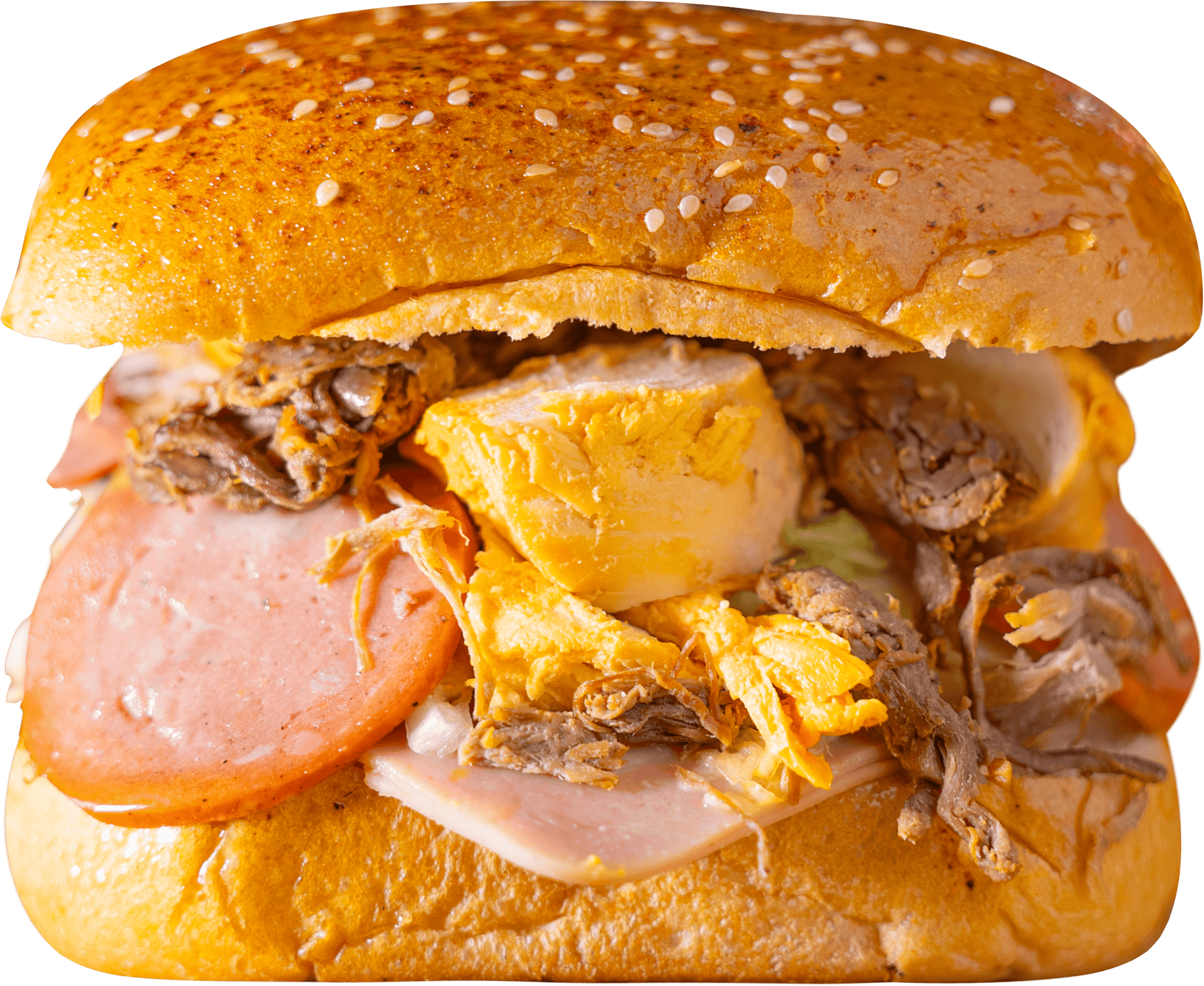 Delicioso pan Artesanal Brioche esponjoso, semillas blancas, cortes finos de batavia seleccionada. Relleno de trozos de pollo aliñado, adición de salami, cerne seleccionado desmechada. trozos de quesillo doble crema y jamón.