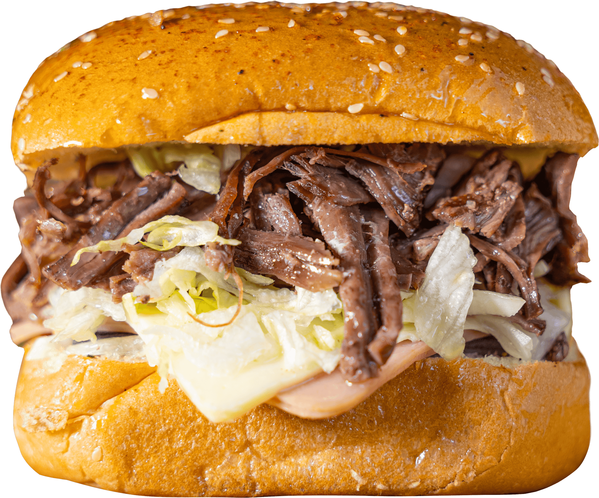 Delicioso pan Artesanal Brioche esponjoso, semillas blancas, cortes finos de batavia seleccionada. Relle- na con trozos de lomo de res freídos bañados en vino y salsa de la casa, acompañados con champiñones salteados en salsa de la casa, trozos de quesillo doble crema y jamón.