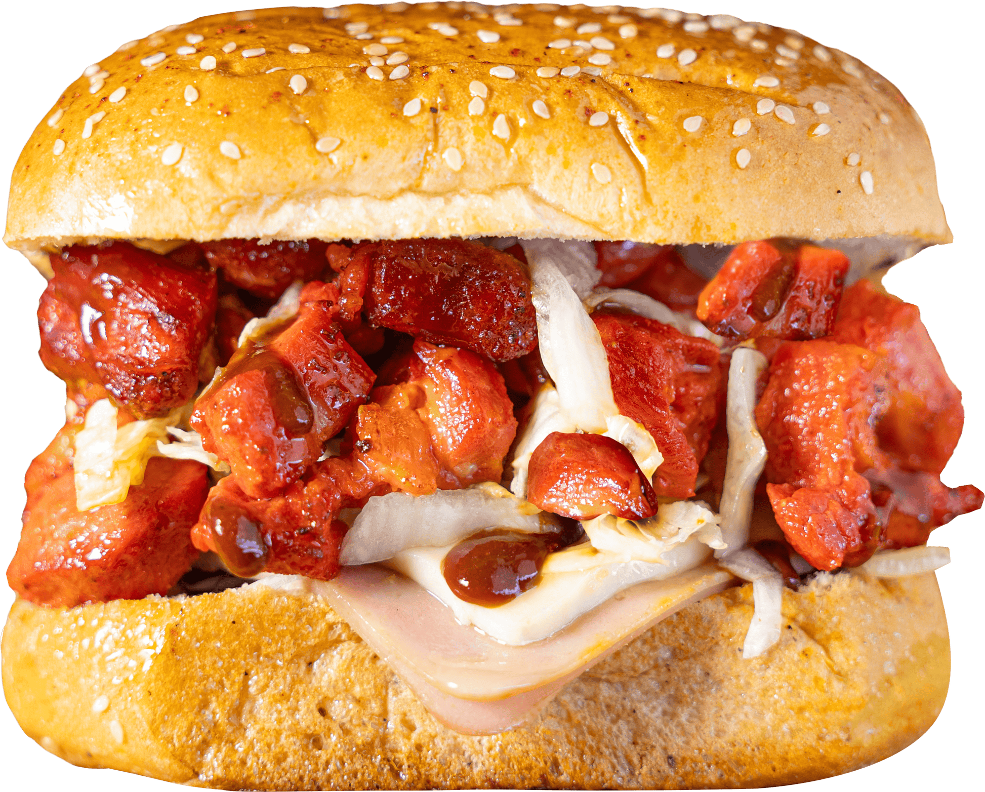 Delicioso pan Artesanal Brioche esponjoso, semillas blancas, cortes finos de batavia seleccionada. Relleno de exquisitas costillas de cerdo ahumadas bañadas en salsa BBQ con adición de trozos de quesillo doblé crema y jamón