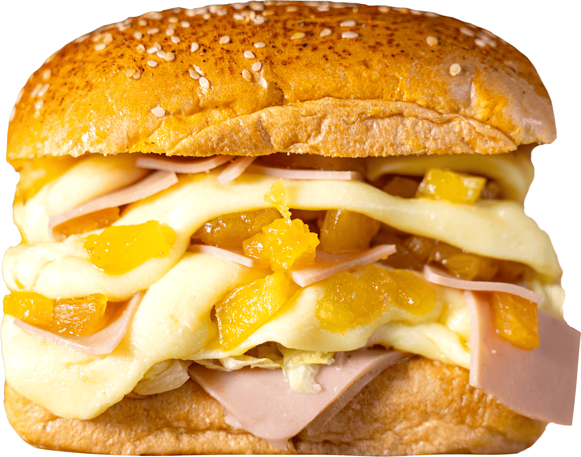 Delicioso pan Artesanal Brioche esponjoso, semillas blancas, cortes finos de batavia seleccionada. Relleno de queso fundido doble crema mezclado con exquisitos trozos de piña oro miel, jamón salteado en salsa negra y huevo de codorniz.