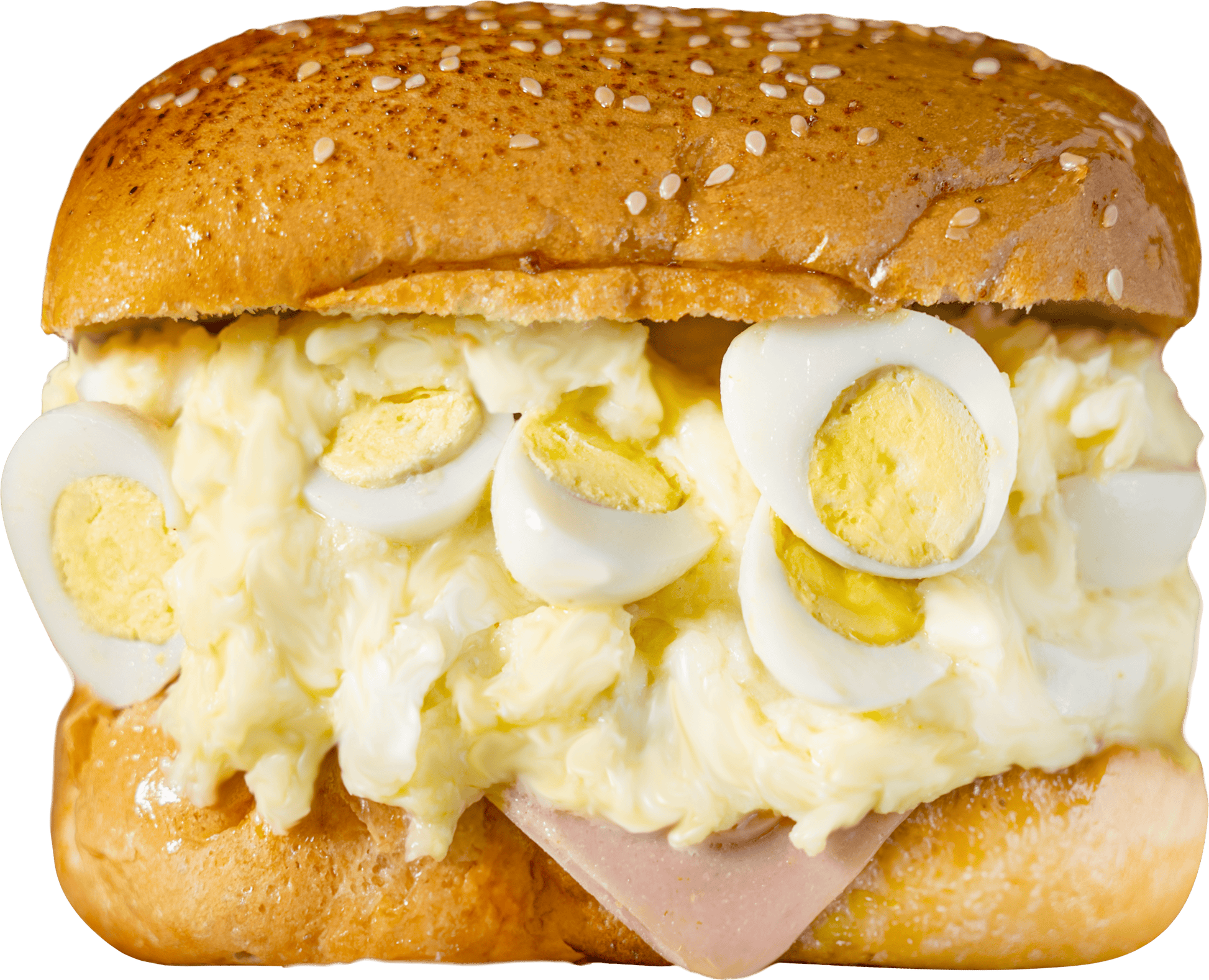 Delicioso pan Artesanal Brioche esponjoso, semillas blancas, cortes finos de batavia seleccionada. Rellena de excesivo queso fundido doble crema, jamón y abundantes huevos de codorniz duros salteados en salsa de la casa.