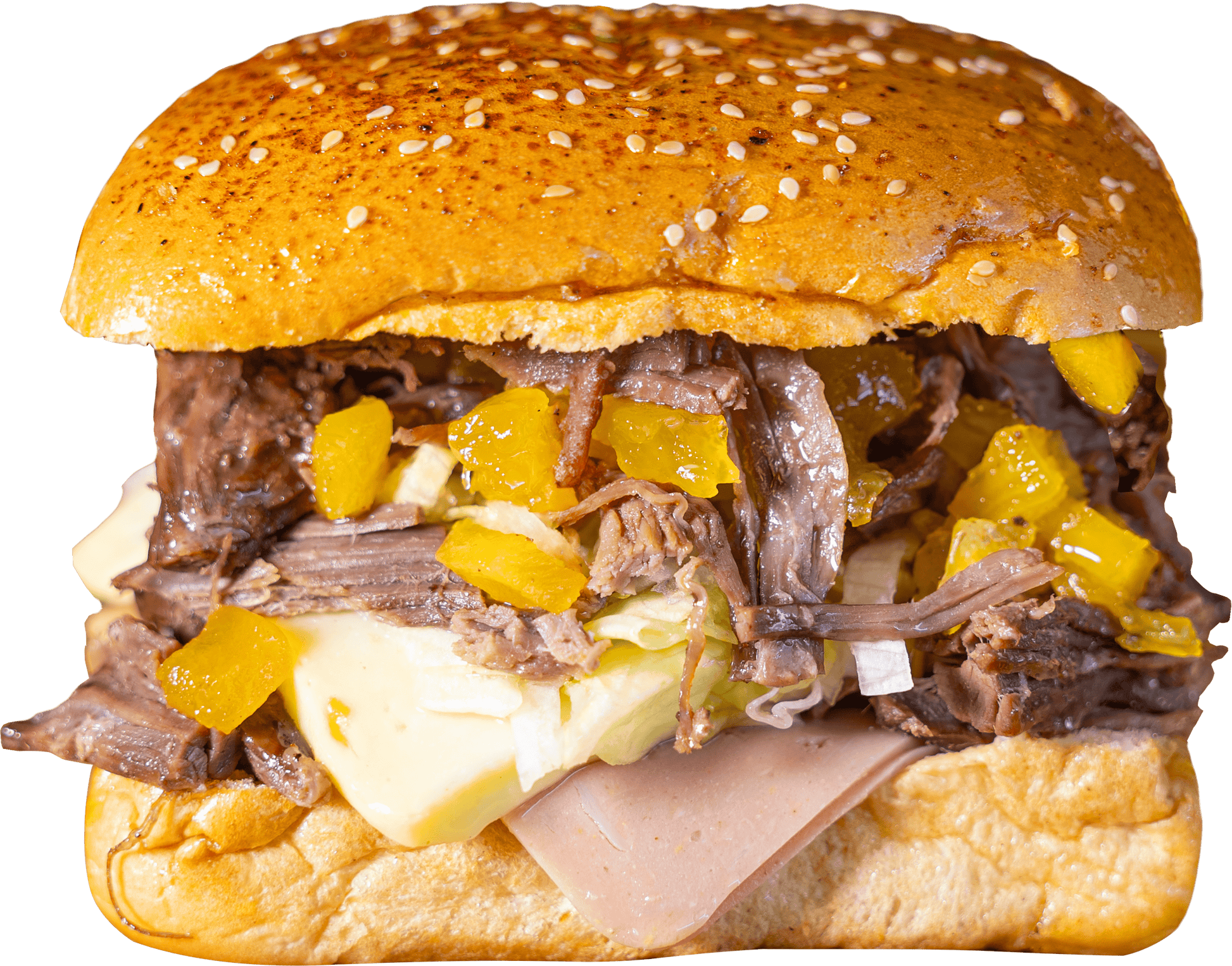 Delicioso pan Artesanal Brioche esponjoso, semillas blancas, cortes finos de batavia seleccionada. Rellena con carne seleccionada desmechada con aderezo, bañada en salsa de tomate acompañado de deliciosos trozos de piña asada, adición de trozos de queso doble crema y jamón