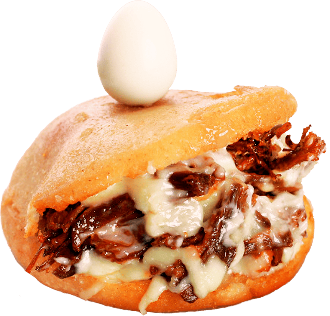 Deliciosa arepa santandereana de maíz blanco especial rellena con carne seleccionada desmechada con aderezo, bañada en salsa de tomate casera con adición de trozos de quesillo doble crema y huevo de codorniz.