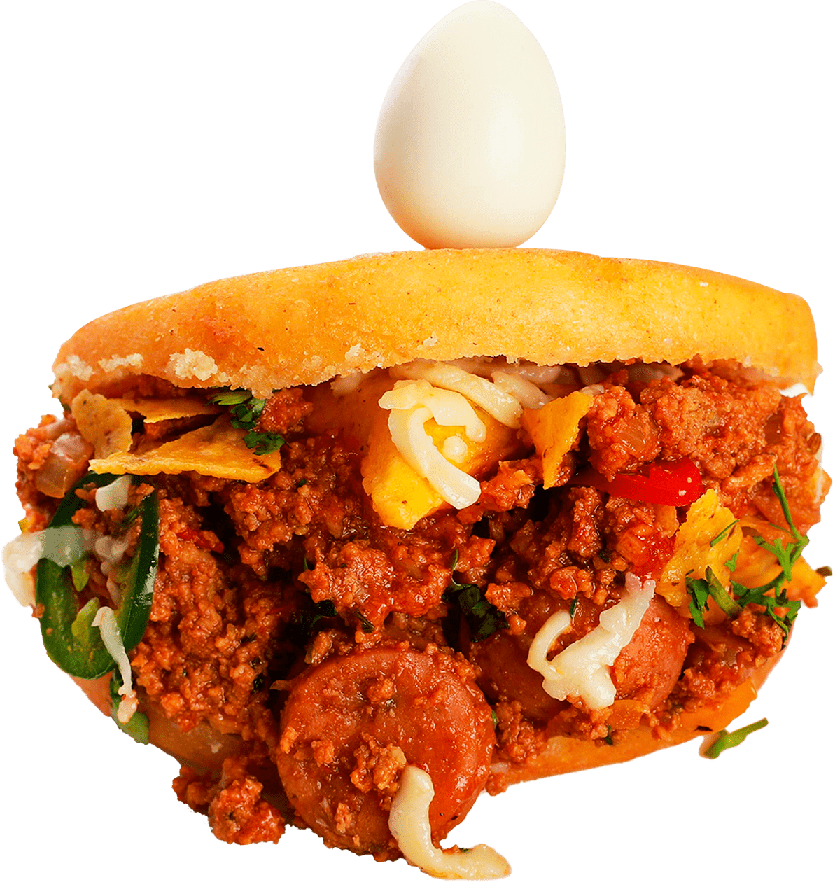 Deliciosa arepa santandereana de maíz blanco especial rellena de pulpa molida de res y cortes de chorizo freído en salsa de la casa mezclado con pico de gallo cebolla picadas, tomate y cilantro con adición de picaresco jalapeño fresco, trozos de quesillo doble crema y huevo de codorniz.