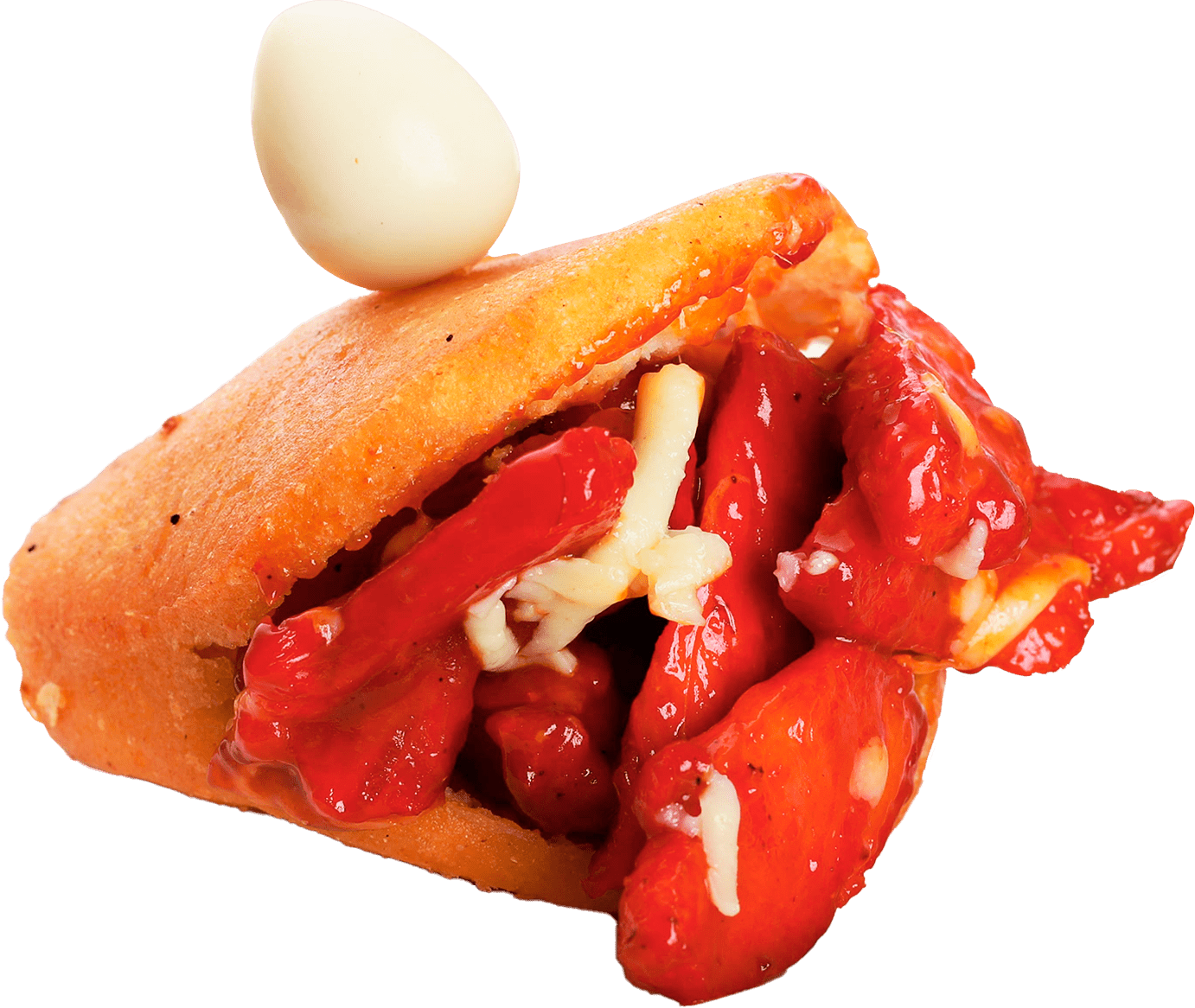 Deliciosa arepa santandereana de maíz blanco especial rellena de exquisitas costillas de cerdo ahumadas bañadas en salsa BBQ con adición de trozos de quesillo doblé crema y huevo de codorniz.