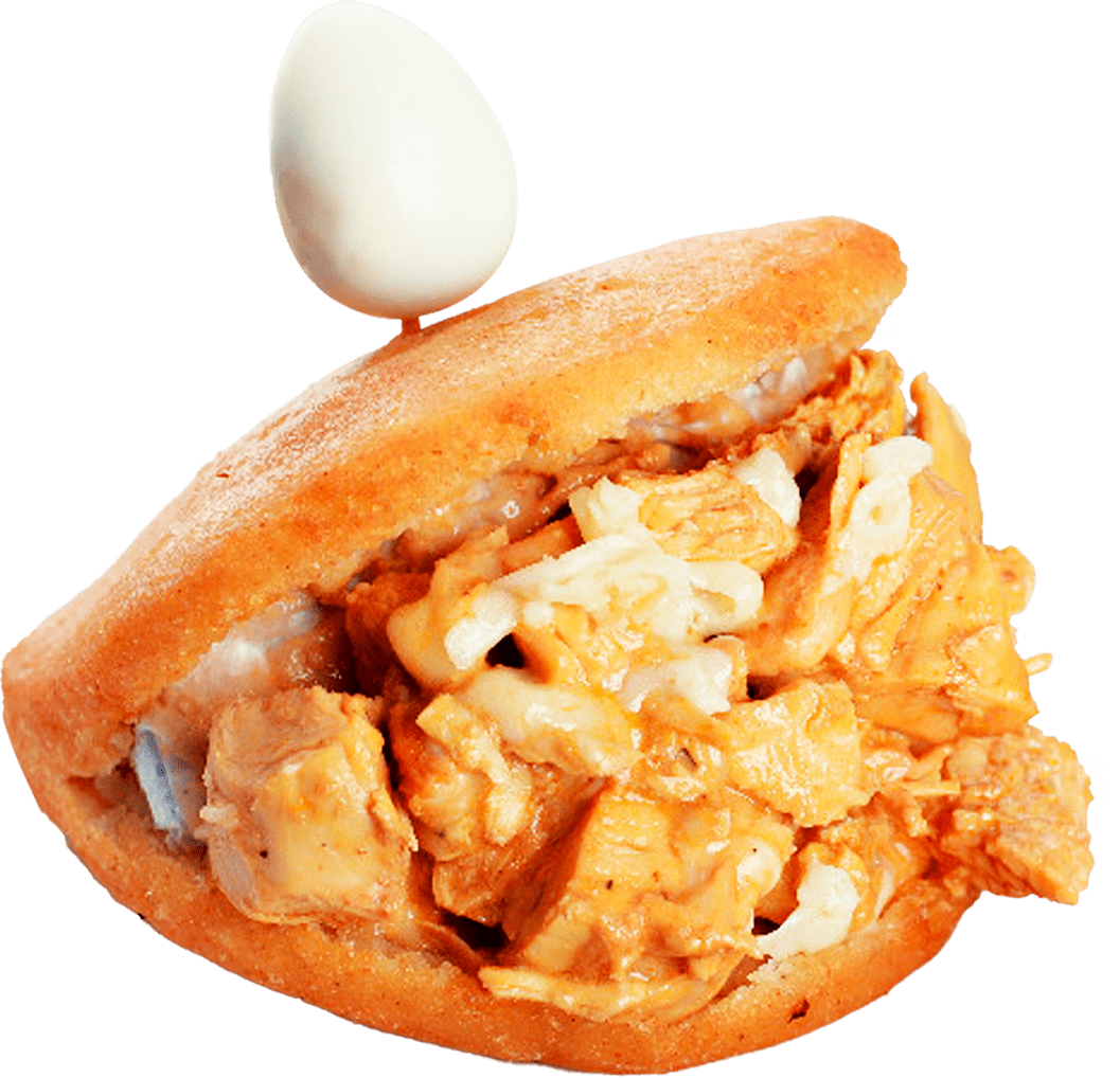 Deliciosa arepa santandereana de maíz blanco especial rellena de trozos de pollo aliñado salteado con vino blanco y bañados en salsa negra, salsa de tomate italiana, trozos de quesillo doble crema y huevo de codorniz.