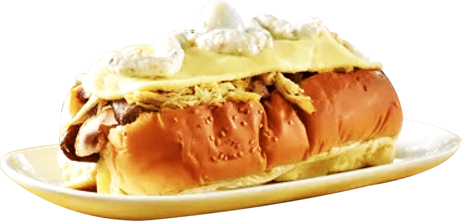 Delicioso perro con pan de la casa blanco con trozos de tocineta freida, salchicha americana, suculentos trozos de res salteados con pollo desmechado y conservado en finas hierbas, abundante queso fundido, huevo de codorniz y salsas de la casa.